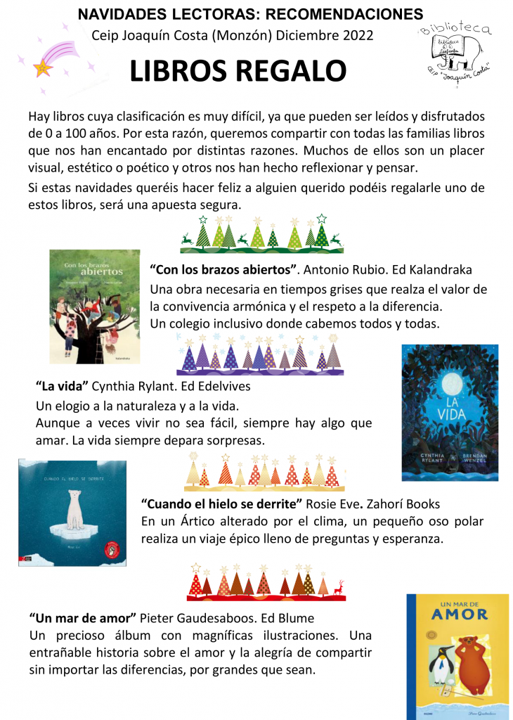 Estas son las ya tradicionales recomendaciones literarias que os proponemos para esta Navidad de 2022 desde la Biblioteca “Leefanta” del C.E.I.P. ”Joaquín Costa” de Monzón.