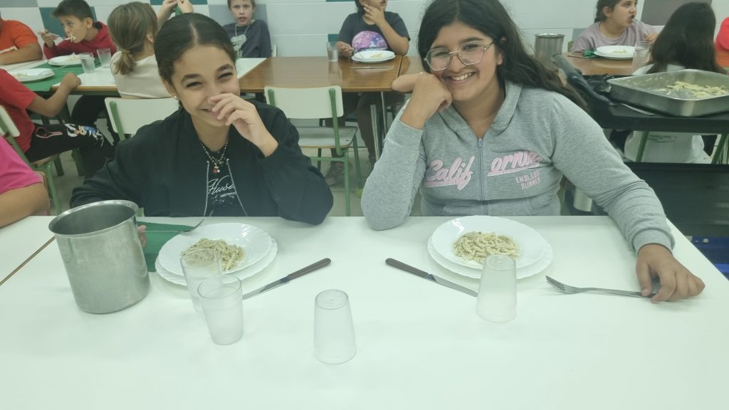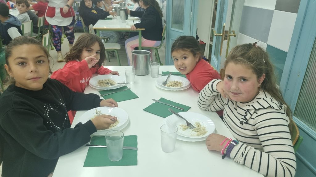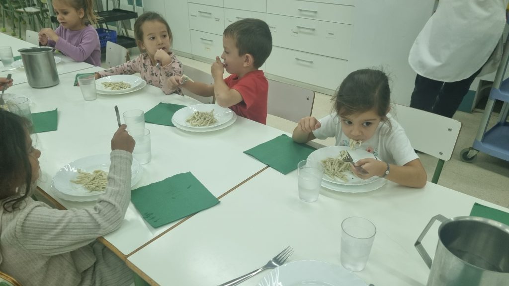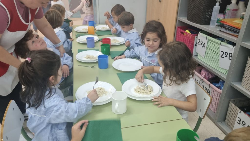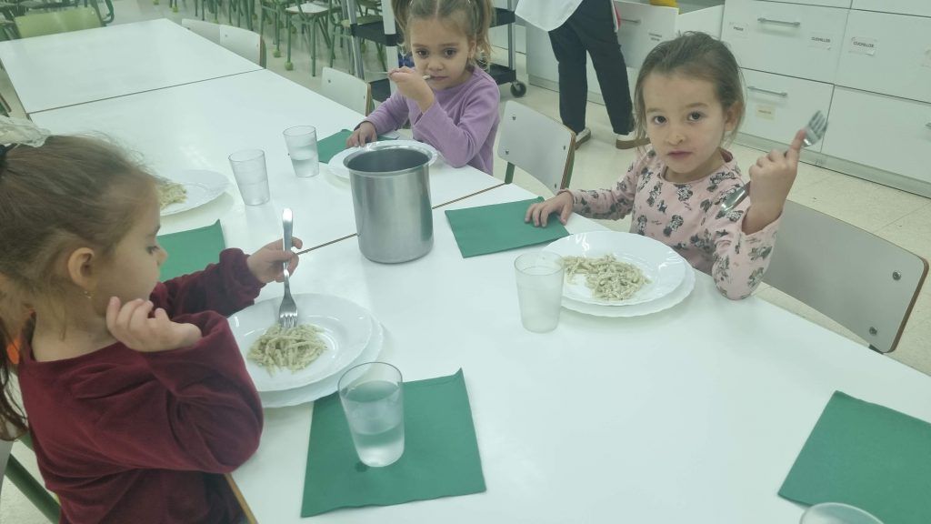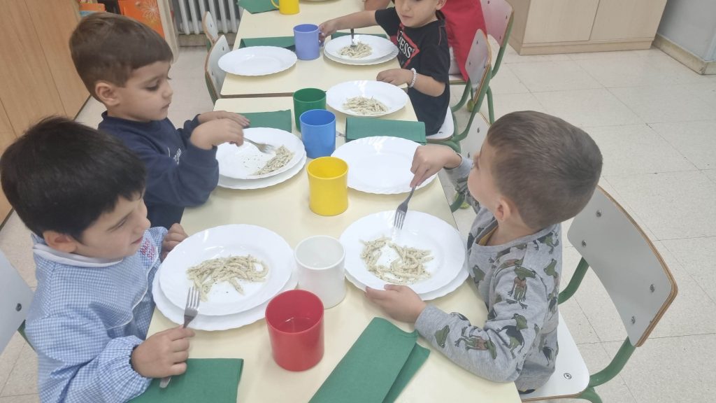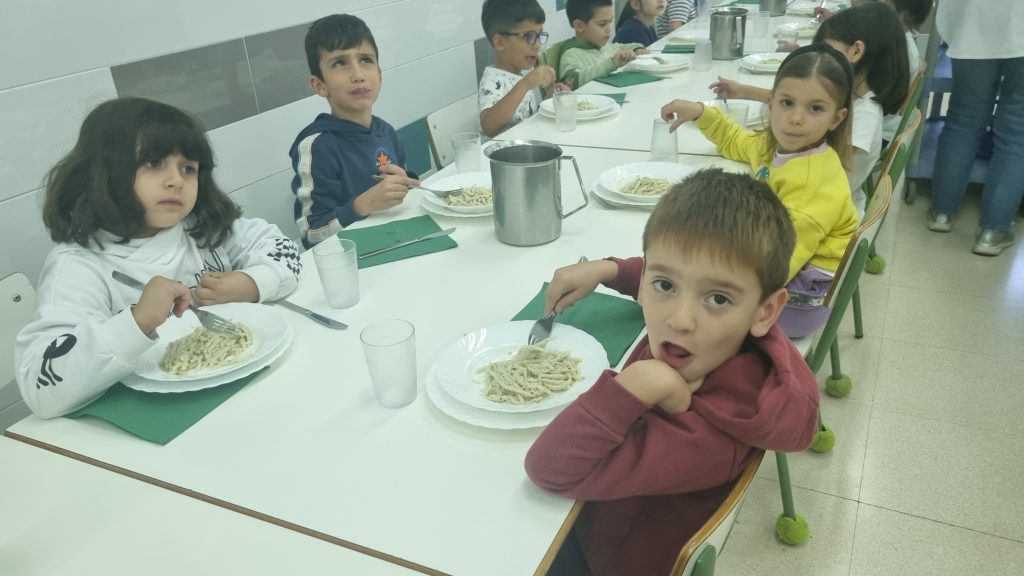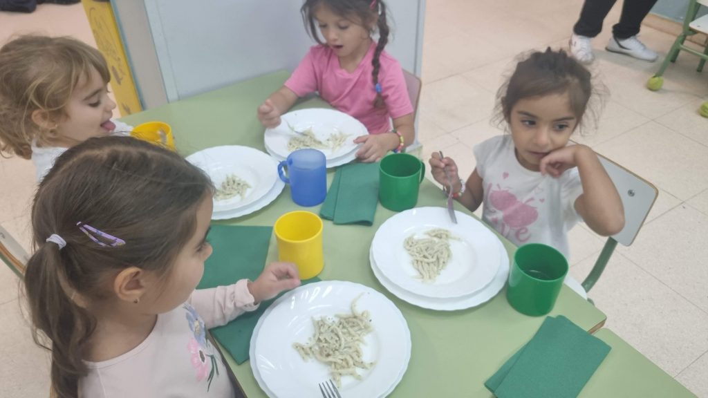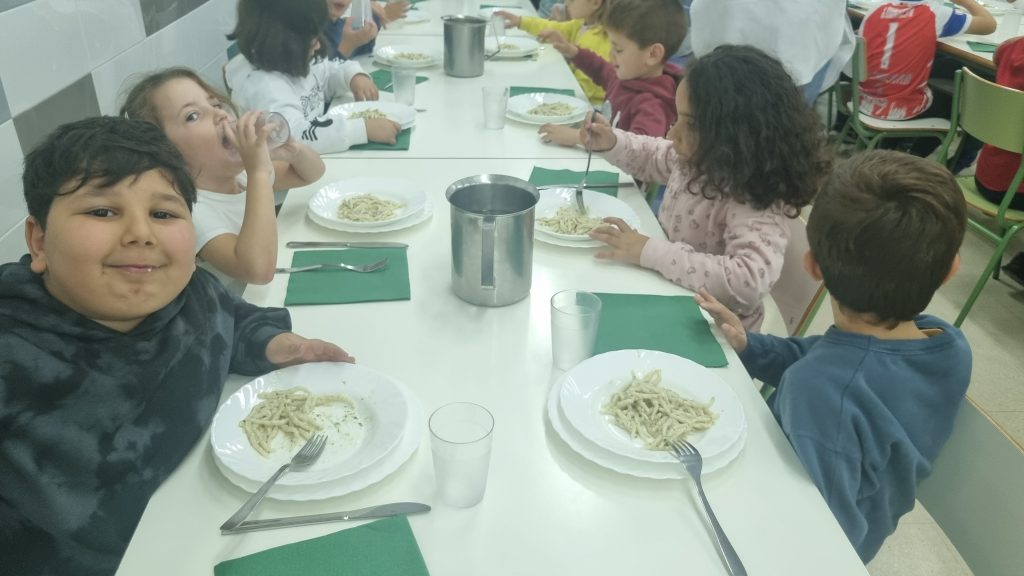Para celebrar este día en nuestro comedor escolar, nuestras cocineras Yasmina, Cristina y Pili han querido cocinar unos macarrones al pesto elaborando ellas mismas la pasta fresca que podéis ver en las imágenes que acompañan a este texto. Esta pasta elaborada por ellas mismas solo han sido una pequeña muestra porque por razones lógicas es imposible elaborar la pasta fresca para todos los comensales. Por ello se ha utilizado una pasta fresca pero comercial, no artesanal.