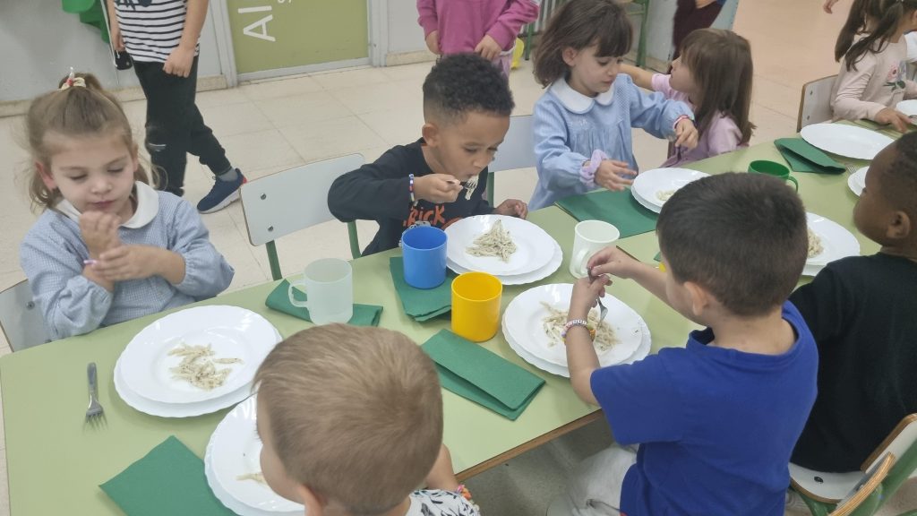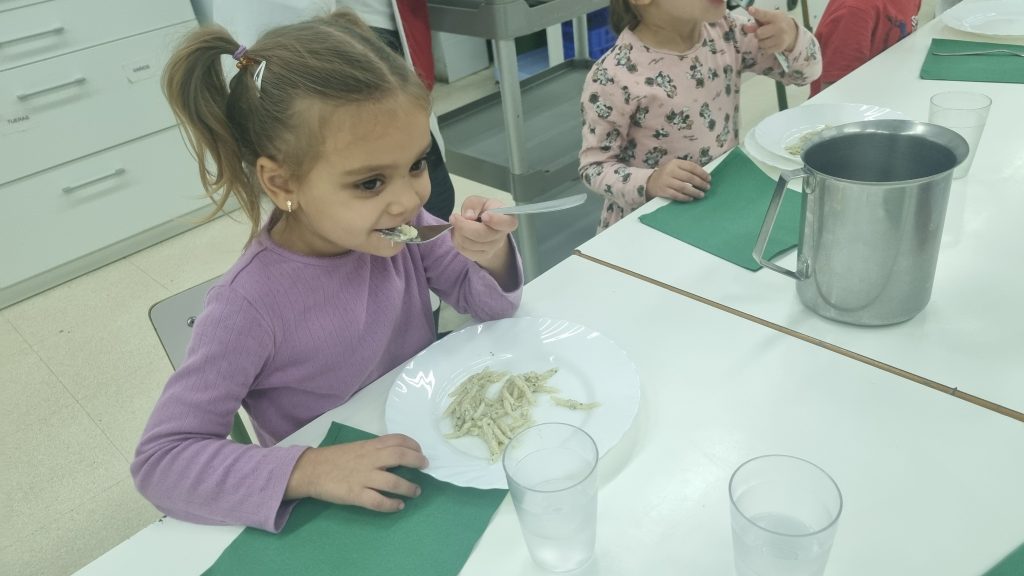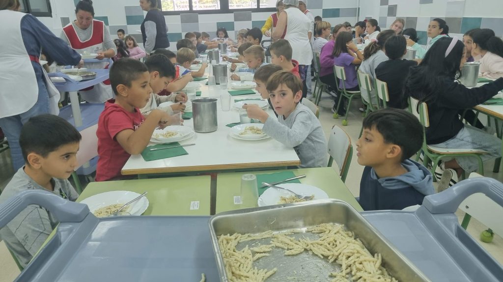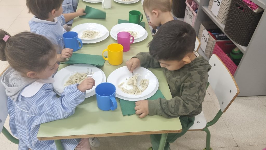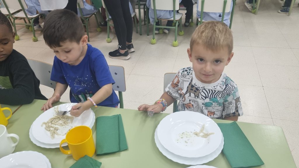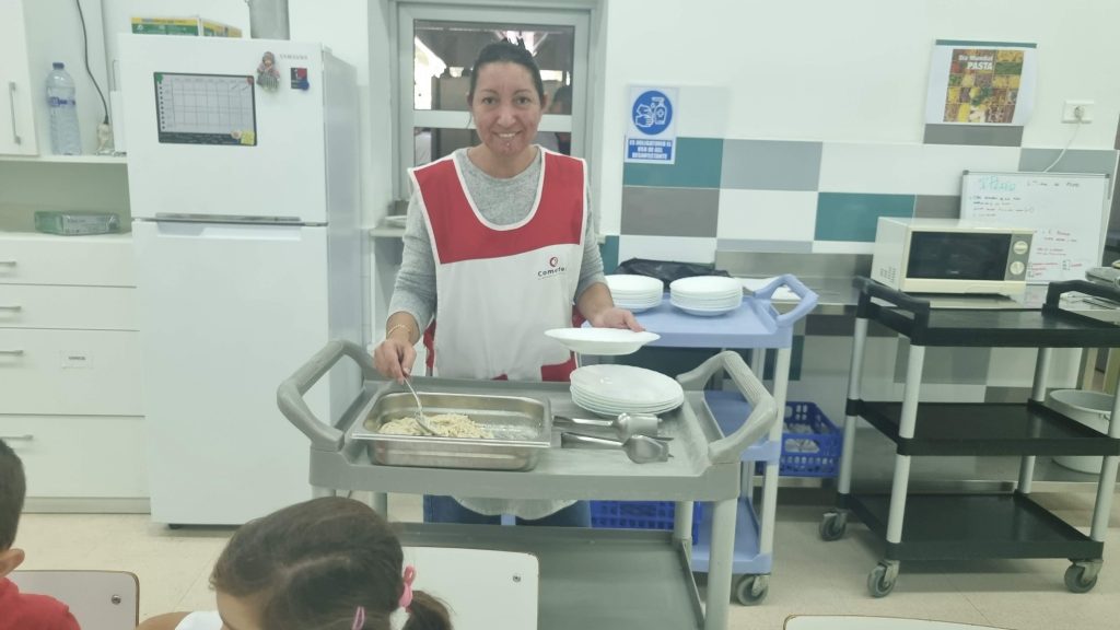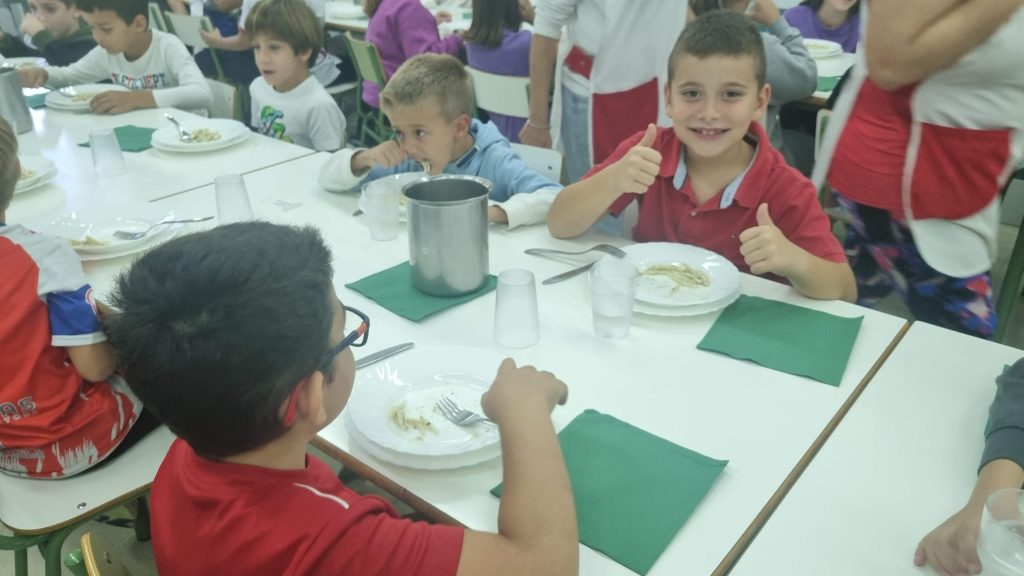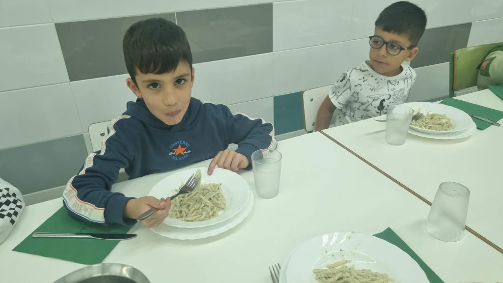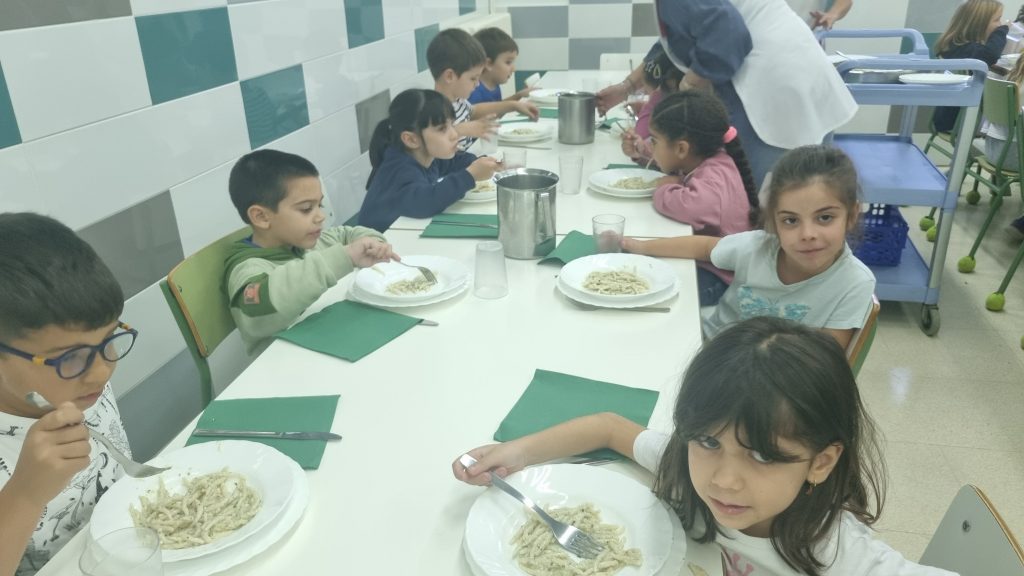 Para celebrar este día en nuestro comedor escolar, nuestras cocineras Yasmina, Cristina y Pili han querido cocinar unos macarrones al pesto elaborando ellas mismas la pasta fresca que podéis ver en las imágenes que acompañan a este texto. Esta pasta elaborada por ellas mismas solo han sido una pequeña muestra porque por razones lógicas es imposible elaborar la pasta fresca para todos los comensales. Por ello se ha utilizado una pasta fresca pero comercial, no artesanal.