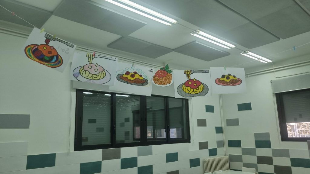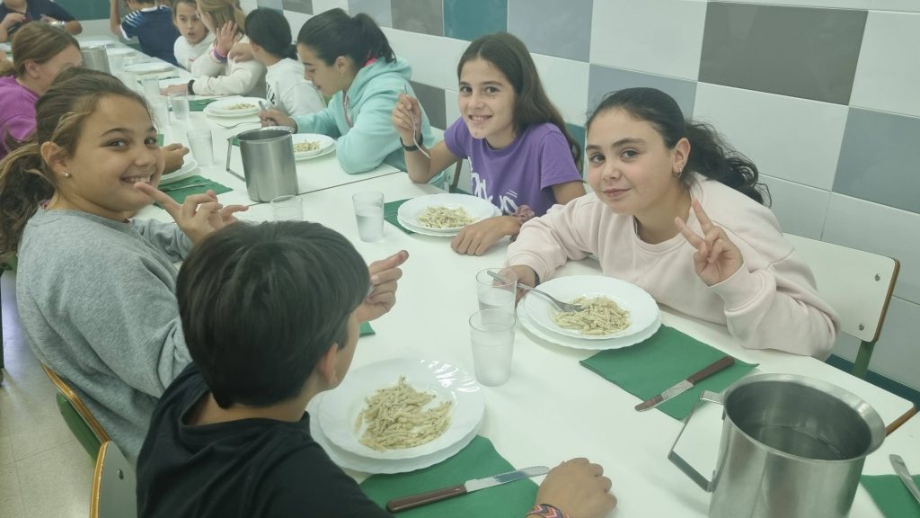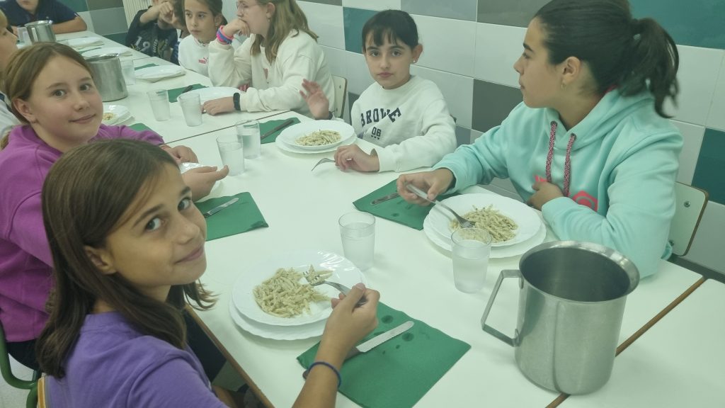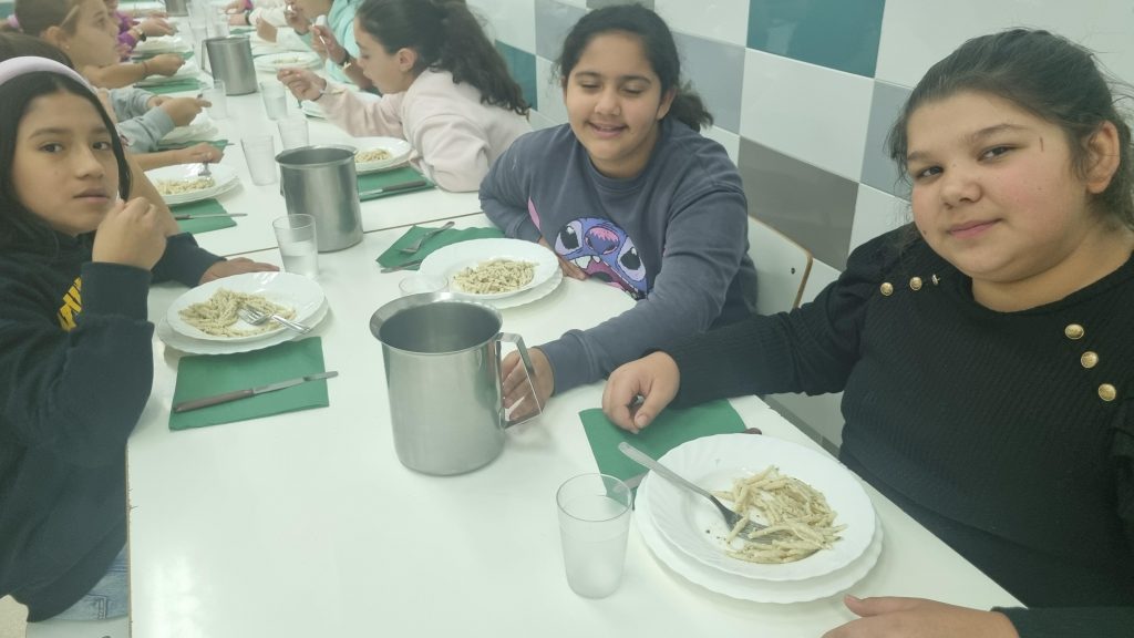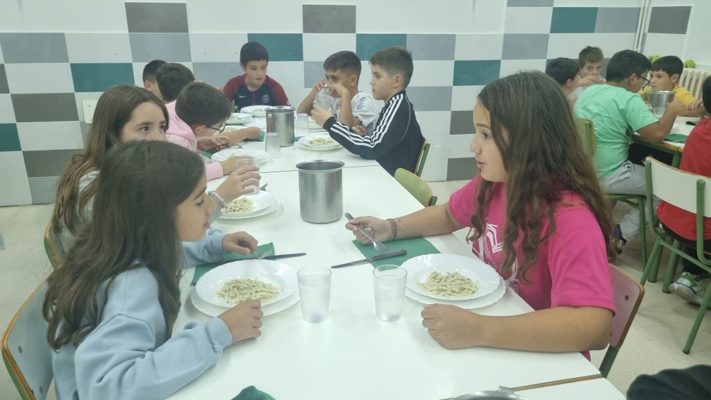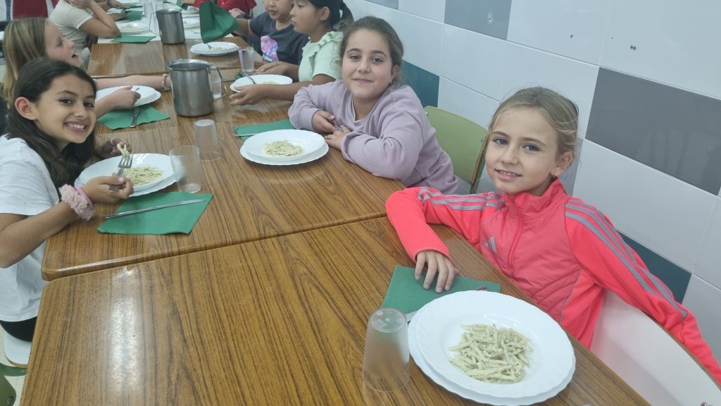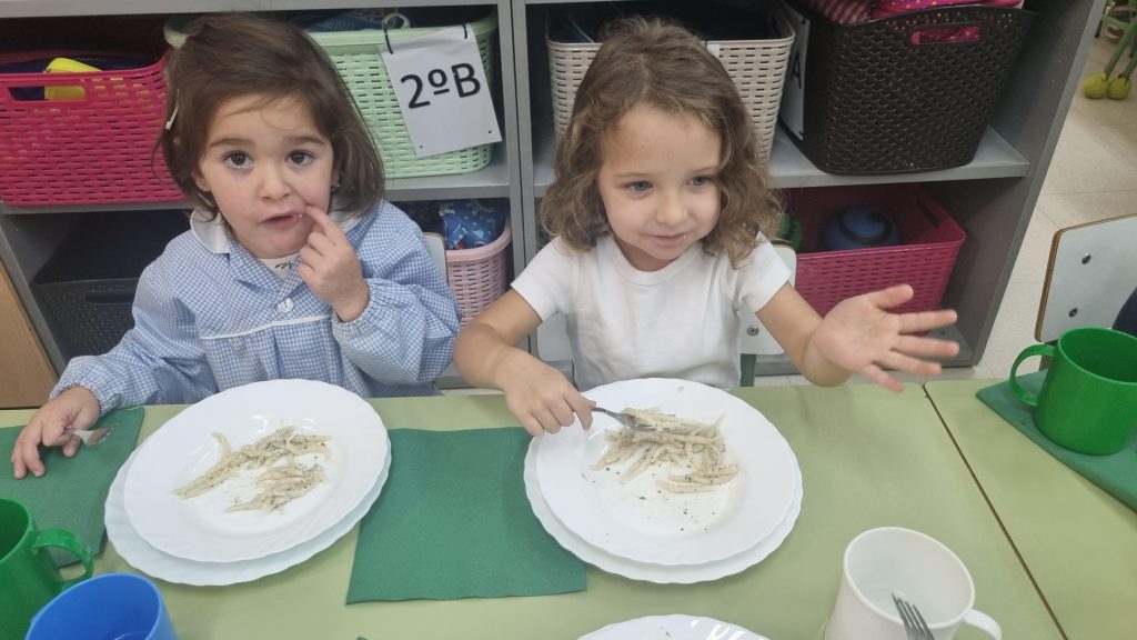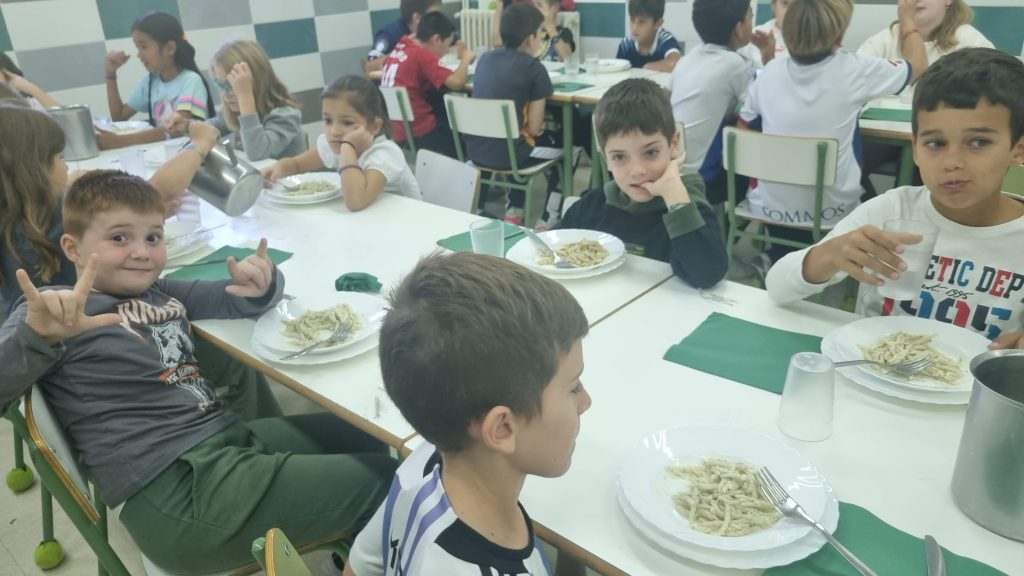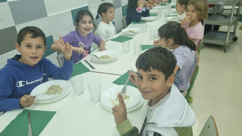 Para celebrar este día en nuestro comedor escolar, nuestras cocineras Yasmina, Cristina y Pili han querido cocinar unos macarrones al pesto elaborando ellas mismas la pasta fresca que podéis ver en las imágenes que acompañan a este texto. Esta pasta elaborada por ellas mismas solo han sido una pequeña muestra porque por razones lógicas es imposible elaborar la pasta fresca para todos los comensales. Por ello se ha utilizado una pasta fresca pero comercial, no artesanal.