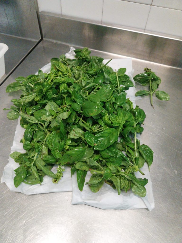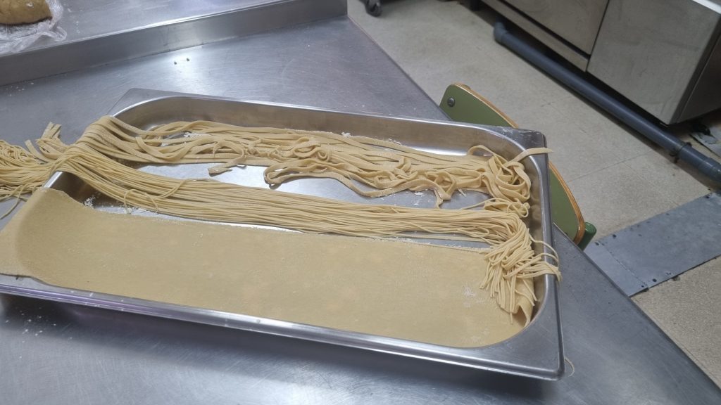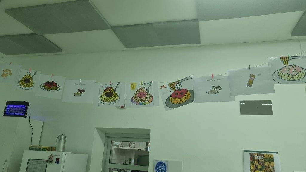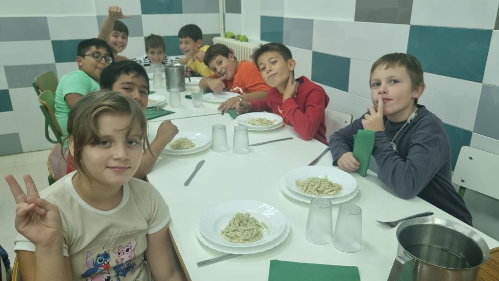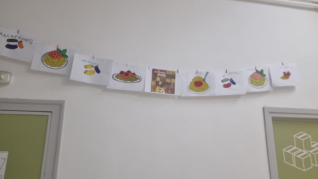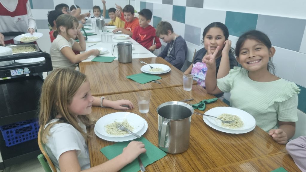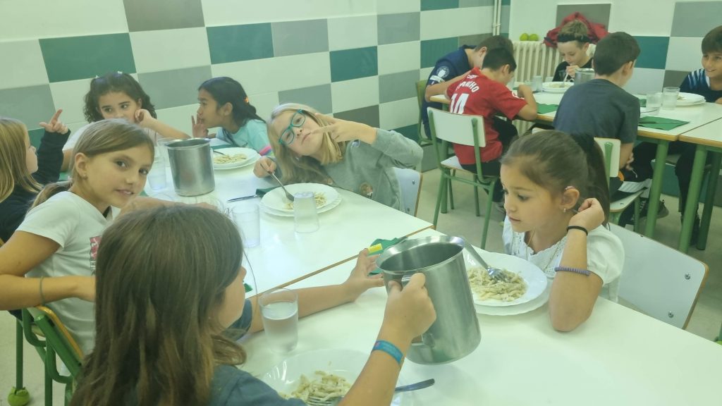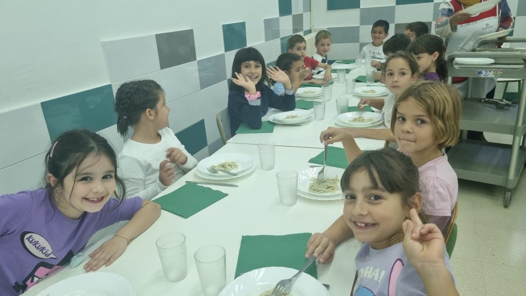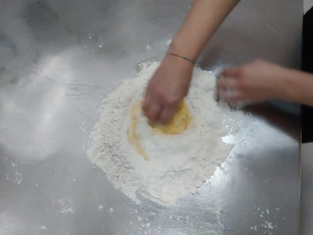 Para celebrar este día en nuestro comedor escolar, nuestras cocineras Yasmina, Cristina y Pili han querido cocinar unos macarrones al pesto elaborando ellas mismas la pasta fresca que podéis ver en las imágenes que acompañan a este texto. Esta pasta elaborada por ellas mismas solo han sido una pequeña muestra porque por razones lógicas es imposible elaborar la pasta fresca para todos los comensales. Por ello se ha utilizado una pasta fresca pero comercial, no artesanal.